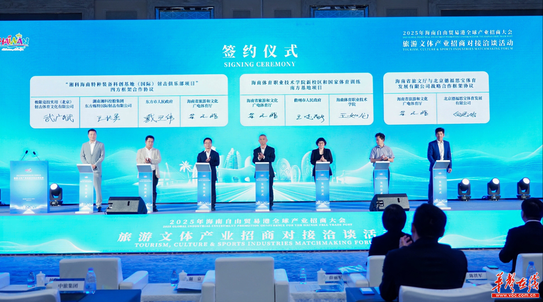 当天,招商大会现场总共签约项目265个,总签约额约2336亿元。在旅游文体产业专场招商对接洽谈活动中,湘科集团与海南省旅游和文化广电体育厅、东方市人民政府、极限竞技实用(北京)射击体育文化有限公司签署四方战略合作协议,推进海南特种装备科创基地项目。