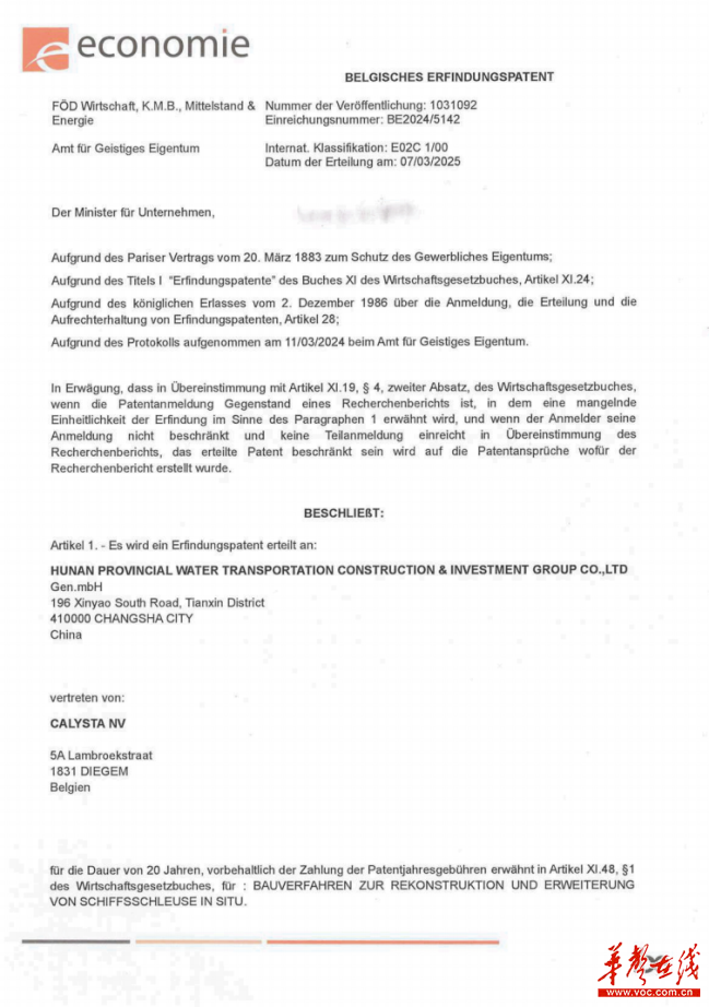 近日,湖南省港航水利集团有限公司所属湖南省水运建设投资集团有限公司(以下简称“省水运投”)独立自主研发的“一种用于在原址改扩建船闸的施工方法”发明专利正式获得比利时联邦政府专利局授权,标志着我国在内河改扩建船闸领域的技术创新成果得到国际权威认可。该专利部分成果已同步应用于湖南省“十四五”重点工程——沅水洪江至辰溪航道建设工程,省水运投以技术创新与管理创新双驱动,树立了行业标杆。